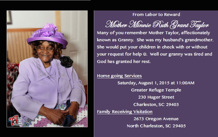 Entered into eternal rest on Monday, July 27, 2015; Mrs. Minnie R. Taylor. Residence: 2673 Oregon Avenue North Charleston, SC 29405.